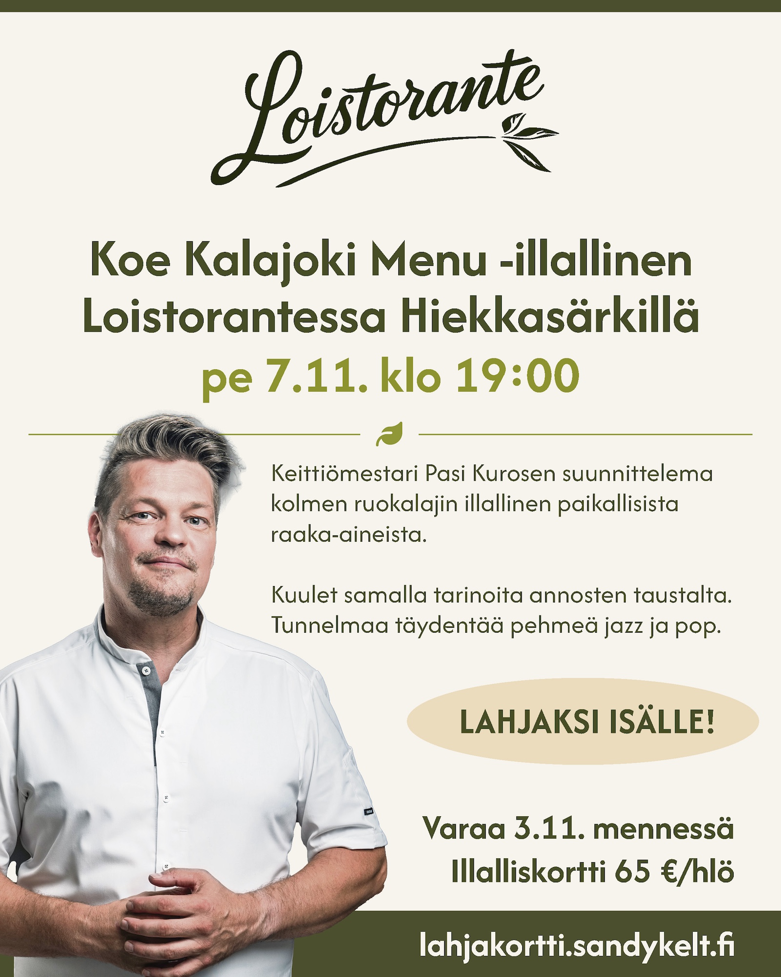 Koe Kalajoki Menu -illallinen ravintola Loistorantessa Hiekkasärkillä pe 7.11. klo 19:00 Keittiömestari Pasi Kurosen suunnittelema kolmen ruokala
