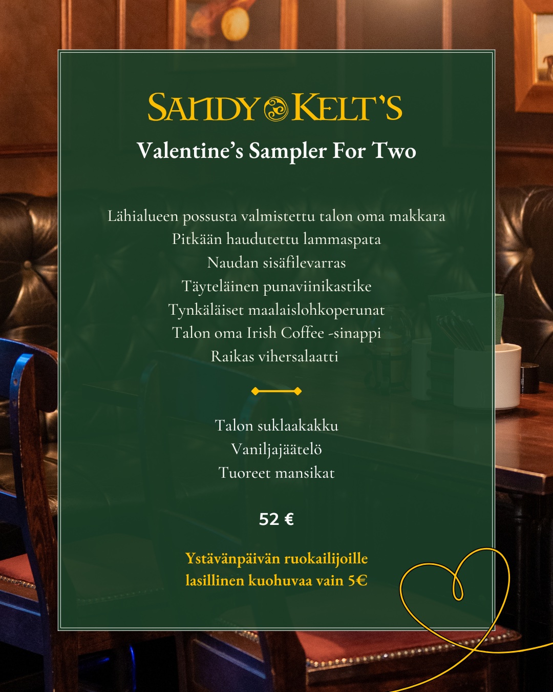 Vietä Ystävänpäivää 14.2. Sandy Keltissä nauttimalla erityismenu kahdelle juuri sen erityisen ystävän kanssa!