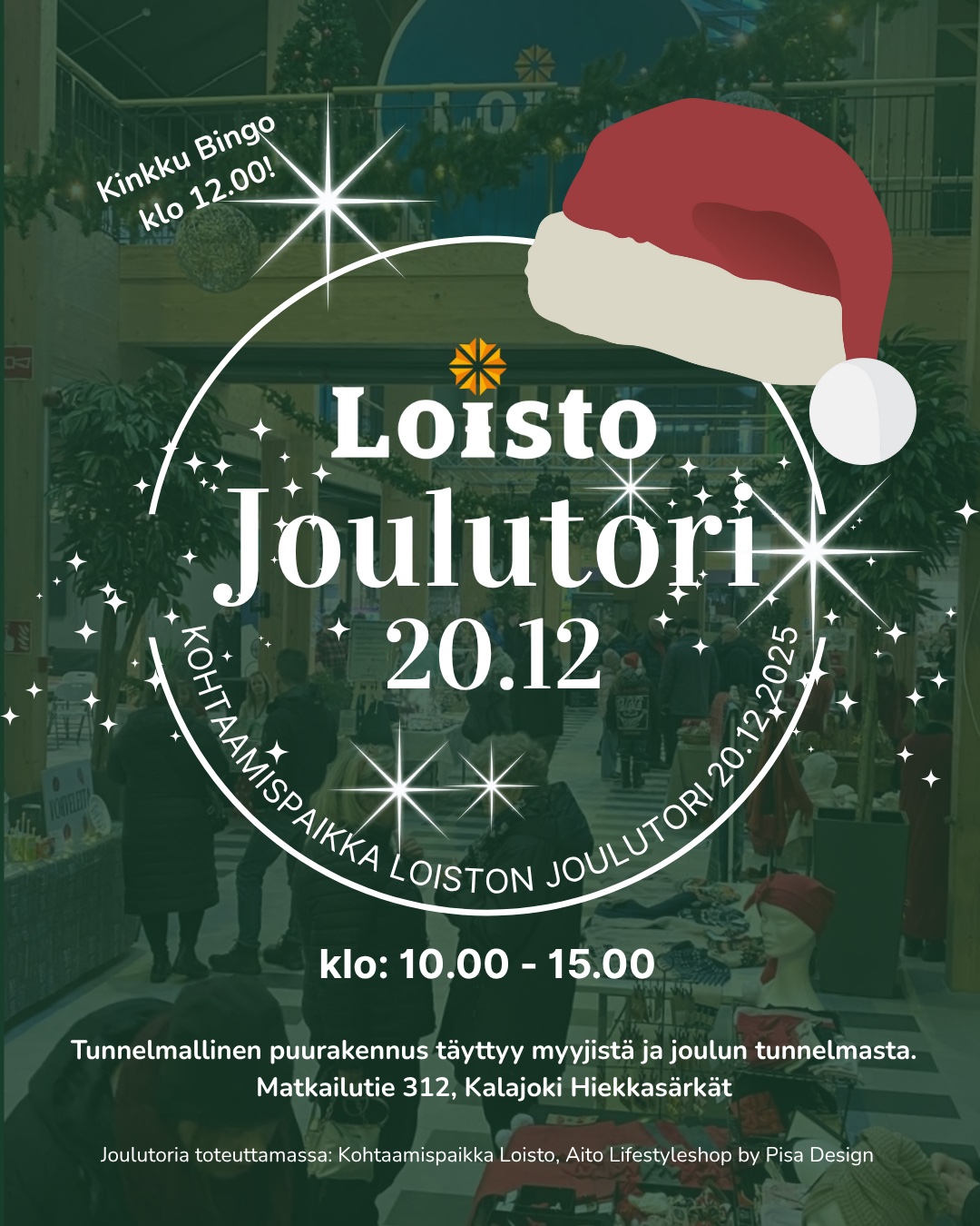 Perinteinen joulutori järjestetään jälleen lauantaina 20.12.2025 Kohtaamispaikka Loistossa, Kalajoen Hiekkasärkillä.