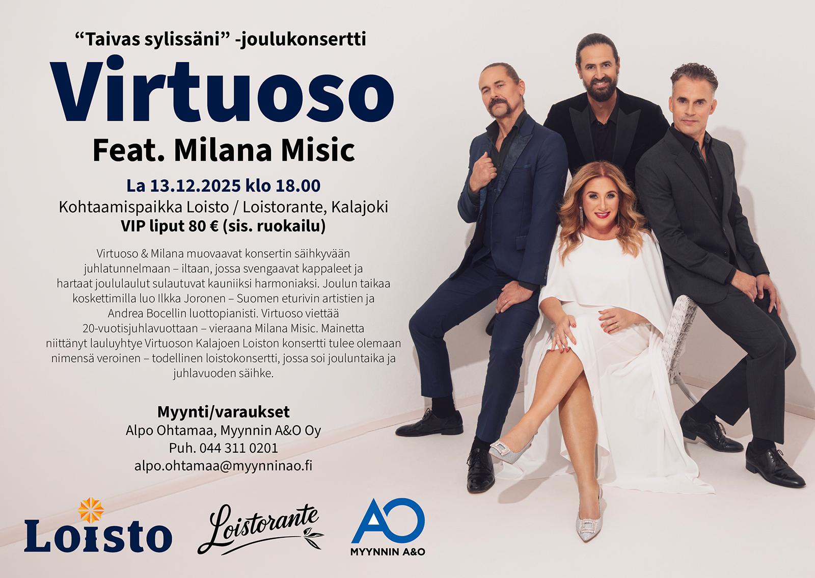 Virtuoso & Milana Misic kutsuvat sinut säihkyvään juhlatunnelmaan – iltaan, jossa svengaavat kappaleet ja herkät joululaulut sulautuvat kauniiksi harmoniaksi.